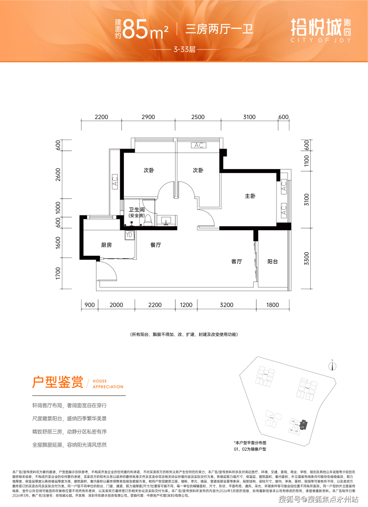 85㎡三房两厅一卫:折后总价299万-313万(共62套,刚需入门首选,总价最低,适配预算有限的年轻小家庭)