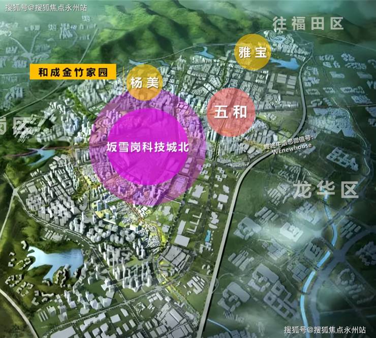 和成金竹家园,位于龙岗区坂田街道环城路与发达路交汇处东南侧,作为华为全球总部基地所在的坂雪岗科技城,紧挨龙华区,这里可谓是龙岗不可或缺的一部分,在2022年GDP高达2252亿元,占比龙岗全区66%,也一度占据龙岗榜首,该片区重点发展现代通信技术、新型显示、云计算、下一代互联网、高端生产性服务和高标准、高品质城市公共服务等,打造成为国际知名的通讯技术与计算机技术研发和总部为主导的综合性新城区。