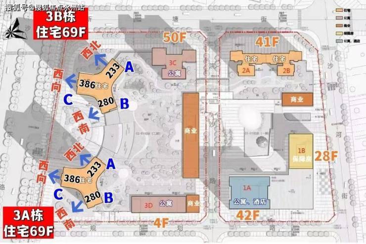 整体分两期开发建设,其中:项目一期东地块包含1栋酒店+商务公寓、1栋保障房、2栋包含一、二单元的住宅;西地块包含2栋高约250米的超高层住宅,另有1栋约50层高的商务公寓。项目二期2栋住宅建筑,地上69层地下3层,建筑高度超过247米。