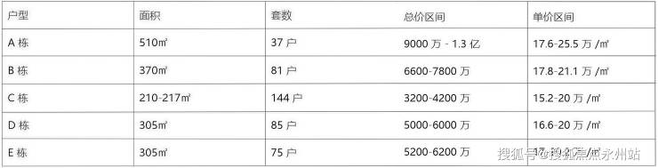 户型规划:全系纯大平层设计,具体分布为:A栋510㎡(30余套,3梯1户)、B栋370-375㎡(80余套,5梯2户)、C栋210-217㎡(120余套,4梯3户)、D栋302-305㎡(80余套,3梯2户)、E栋305-307㎡(80余套,3梯2户),层高3.3-3.6米,均为精装交付。