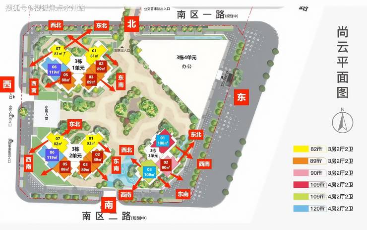 得房率:87.88%(包含赠送),02-03户型是东南朝向,05.06户型是西南朝向。
