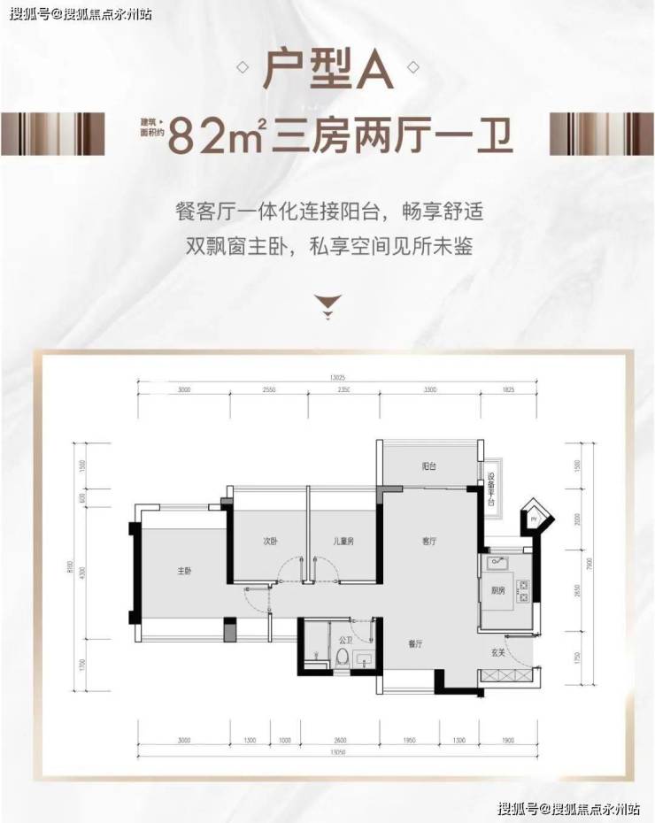 82㎡的3房2厅1卫(户型A),1栋/3栋1单元的05户型,设计的是竖厅南北通透格局,进门入户玄关,客厅3.3米开间,LDKB一体化设计,3个卧室分别做到了3米/2.55米/2.35米的宽度,主卧双飘窗南北通设计,U型厨房,得房率:77.51%(不含赠送),阳台主朝东北向。
