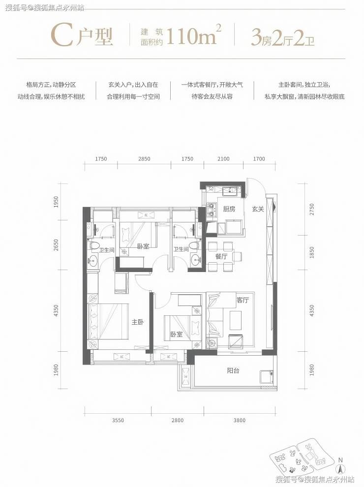 110㎡的3房2厅2卫,A2户型,设计的是经典竖厅格局,客厅3.8米开间,进门玄关,LDKB一体化设计,动静分区,三开间朝南,L型厨房,卫生间干湿分离,西南朝向。