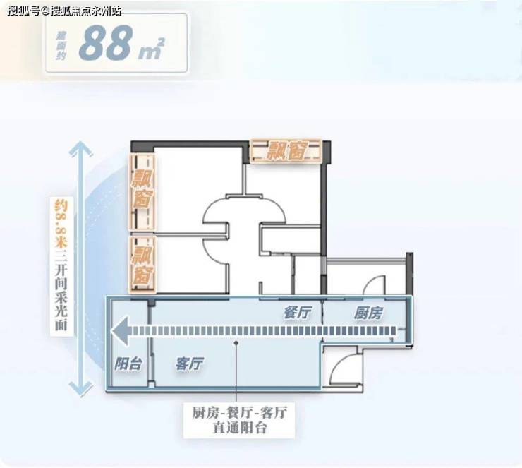 双阳台+8个飘窗的配置,阳光跑进屋子开Party,一侧的采光面就能达到约12.1米。