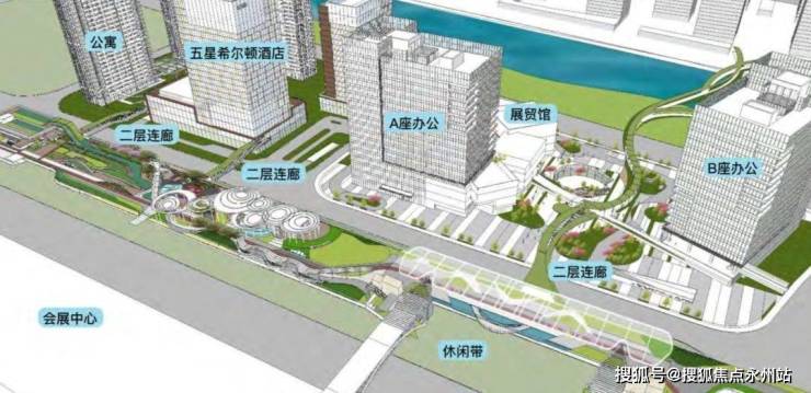 业态组成:3栋商务公寓(T1/T2/T3)、2栋办公写字楼(A/B座)、希尔顿星级酒店群、4.63万㎡产业展览馆及配套商业,实现“办公+会展+商务+休闲”一体化