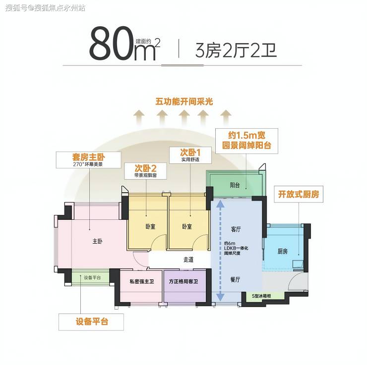 80㎡三房两厅两卫(南北通):全屋配置9个飘窗,主卧采用270°环幕飘窗设计,面积达18.38㎡,可设置独立衣帽间。