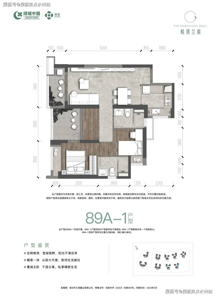 主力产品:89-128㎡三至四房,得房率约 78.85%(不含赠送)或 90%(含赠送),空间利用率高于光明中心区同类项目。
