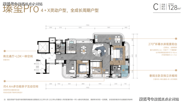 128㎡四房二卫横厅通透C户型:同样是利用了巨多的飘窗做高使用率的户型,算是107㎡横厅户型的放大版,预计大约只有80套。有意思的是这个户型的客厅还能做到南北通透,主卧还有衣帽间。