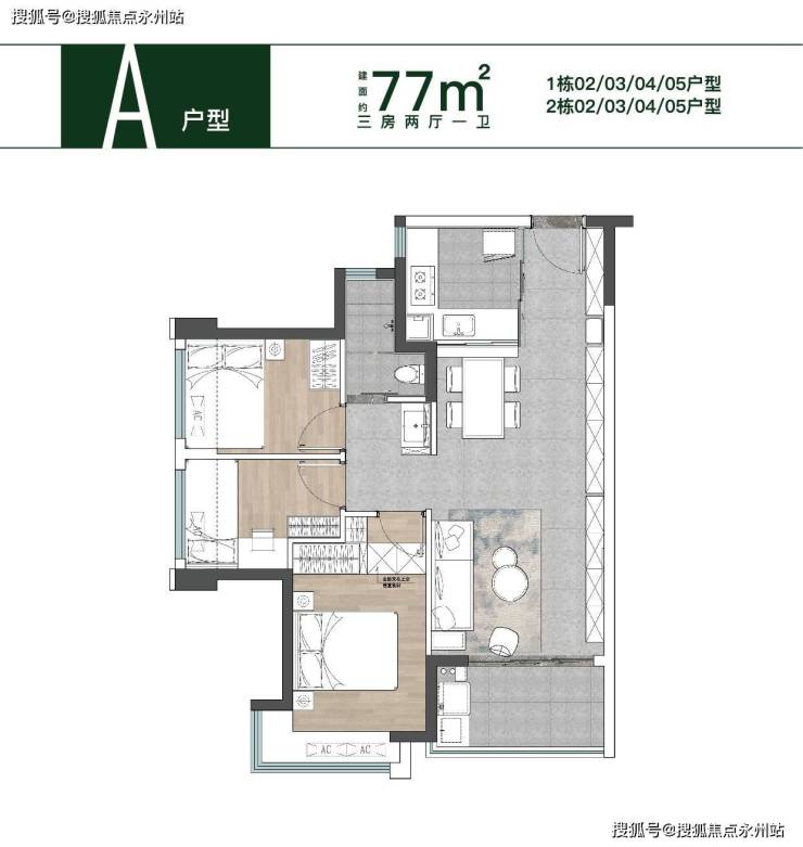 77㎡的3房2厅1卫:设计的是竖厅格局,客餐厅一体化,L型厨房,卫生间三段式分离设计,整体的户型格局对比74㎡差异不大,得房率:78.99%(不含赠送),02.03户型,东北朝向,04.05户型,东南朝向。