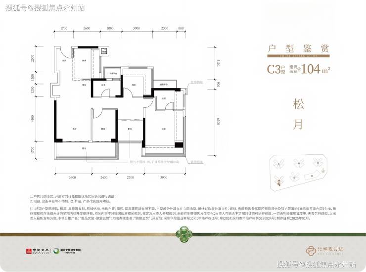 主力户型是104㎡的产品,带10.2㎡的阔景阳台,双阳台、双设备平台设计,加上主卧、书房L型阔景飘窗,户型使用率颇高。