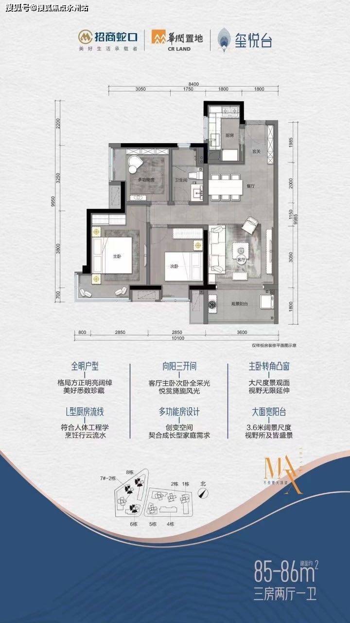 建面约85-113㎡三至四房,满足育龄、三代同堂等家庭空间需求,美好生活一步到位,户型格局方正,朝向采光俱佳,人性化设计厨房,阔景大阳台,主卧套房L字形凸窗设计等。