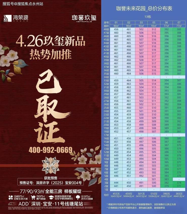 鸿荣源珈誉玖玺13栋于2025年4月21日取证,计划4月26日正式开盘,共推出284套精装房源,户型涵盖77㎡三房一卫90-93㎡三房两卫,备案单价4.79-5.58万/㎡,备案总价371-517万/套,折后单价4.45-5.18万/㎡,折后总价346-482万/套,售楼处资讯热线:400-992-0669,直联开发商,中介勿扰,预计2026年12月30日精装交房。