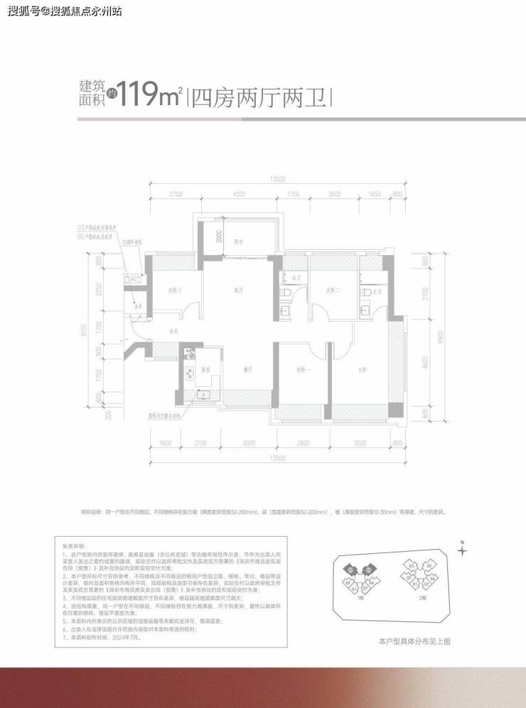 119㎡的4房2厅2卫:设计的竖厅南北通透格局,客厅4米开间,进门独立玄关,4个卧室分别做到了4米/2.8米/2.7米/2.6米的宽度,U型厨房,公卫三段式分离设计,得房率约:95%(包含赠送),阳台主朝西北或东北向,看科学公园景观。