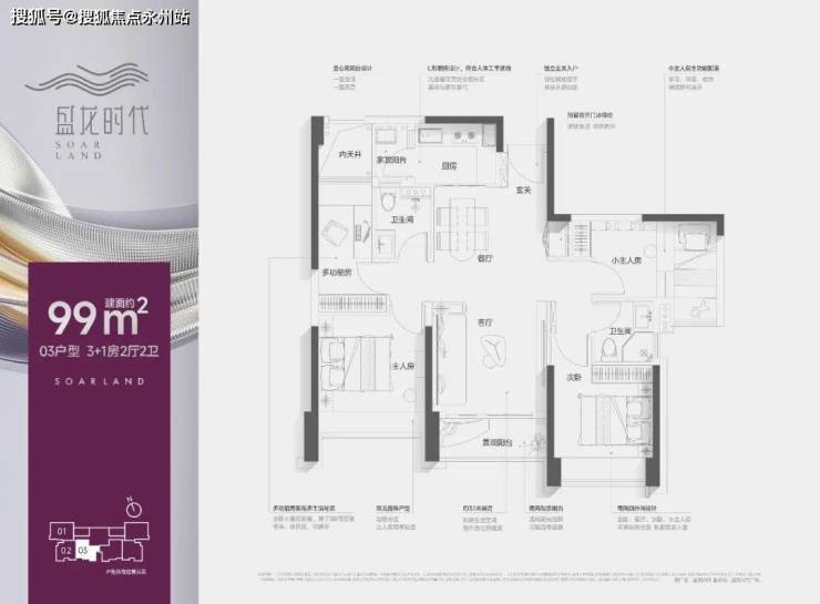 99㎡的3+1房2厅2卫,1栋C座03户型,设计的是竖厅双龙抱珠格局,客厅3.5米开间,进门入户玄关,LDKB一体化,三开间朝南,有1个多功能房间可以改多1个卧室,L型厨房带1个生活阳台,卫生间干湿分离,得房率:约78%(不含赠送),阳台西南朝向。