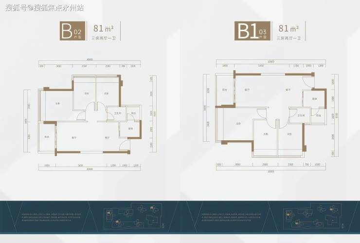 B1-03、B-02为81㎡3房3厅1卫:该户型朝西,次卧朝南,也是双阳台设计,整体布局与65㎡相似,是65㎡的加大版(多一个房间)