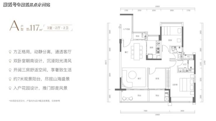 B户型为开阔三房设计,户型方正、格局通透,空间舒展,功能分区科学合理。客厅连接宽约7m的宽幅景观阳台,南向可望蔚蓝大海与晴空万里,景观面极佳
