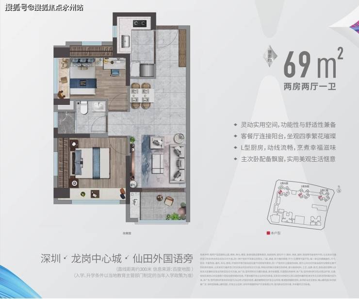 69㎡的2房2厅1卫:设计的是竖厅格局,客餐厅一体化,L型厨房,得房率:70.9%(不含赠送),阳台西南朝向。