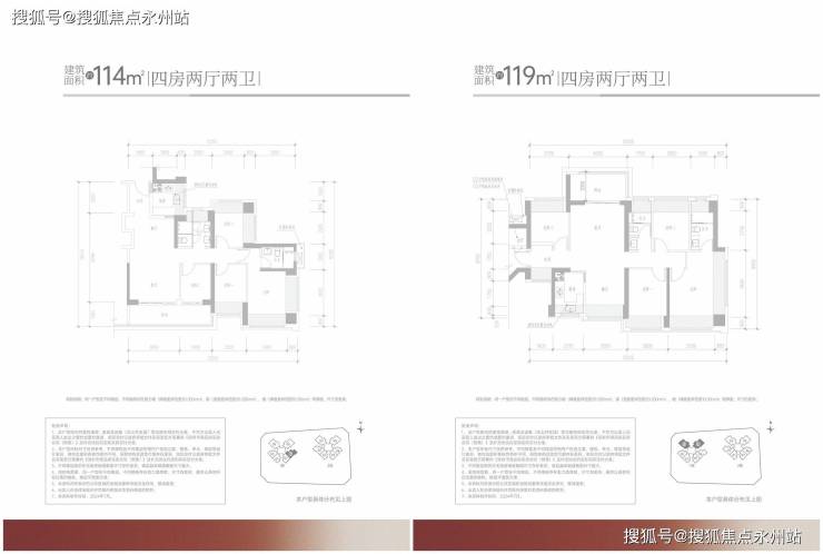 119㎡的4房2厅2卫:设计的竖厅南北通透格局,客厅4米开间,进门独立玄关,4个卧室分别做到了4米/2.8米/2.7米/2.6米的宽度,U型厨房,公卫三段式分离设计,得房率约:95%(包含赠送),阳台主朝西北或东北向,看科学公园景观。