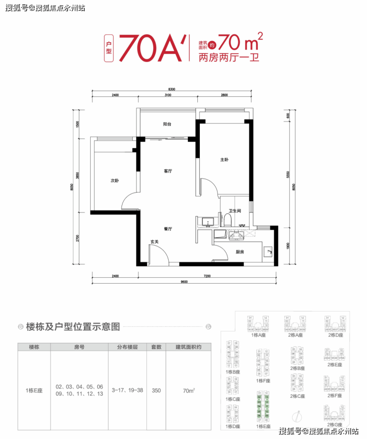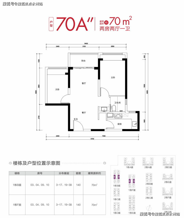 70㎡两房:2742 套,总价255万-316万,单价3.7万 /㎡起。主力户型为“双龙抱珠”设计(70A)和传统竖厅(70B),动静分区明确,卧室带飘窗,卫生间干湿分离。