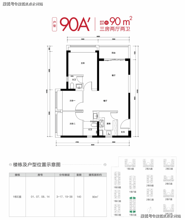 90㎡三房:898套(含97套无障碍户型),总价341万-410万。户型为大横厅设计(90B)或动静分区竖厅(90A),主卧套房配置飘窗,部分端头位户型采光通风更佳。