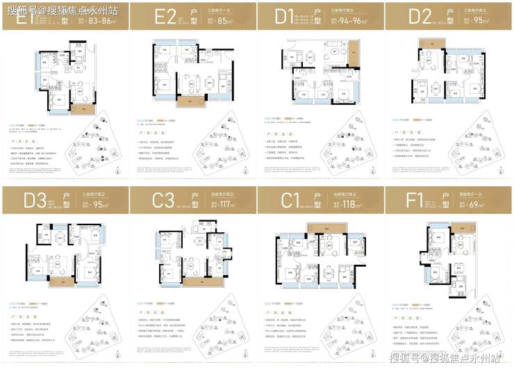 95㎡的3房2厅2卫(D3),设计的是竖厅双龙抱珠格局,客厅3.7米开间,三开间朝南,L型厨房,得房率:72.95%(不含赠送),阳台主朝东南或西南朝向。