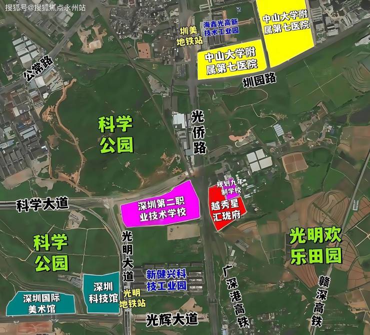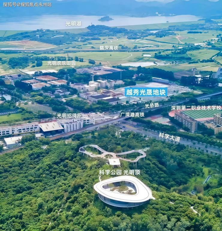 项目位于光明区新湖街道光侨路与科学大道交汇处东南侧,地处光明中心区板块,西北侧与科学公园北翼相邻,东南侧则是充满欢乐的光明欢乐田园,北侧靠近中山大学深圳校区及其附属第七医院,南面距离光明高铁站仅4.8公里。