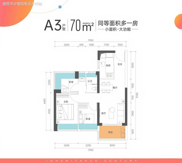 70㎡三房一卫:是项目最小面积段产品,主打高性价比。
