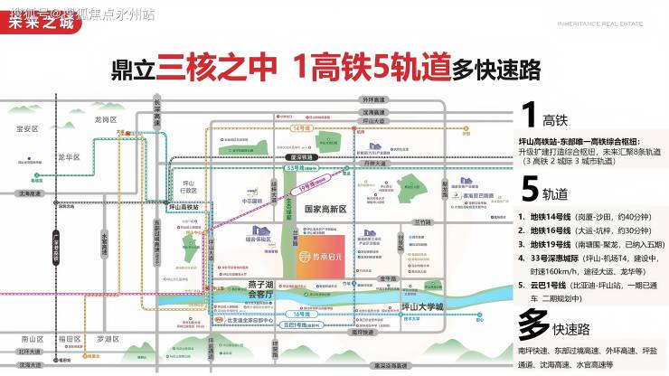 快速路网:南坪快速、沈海高速、外环高速等多条高速环绕,15分钟可达坪山高铁站,30分钟直达盐田港,1小时覆盖深圳全。