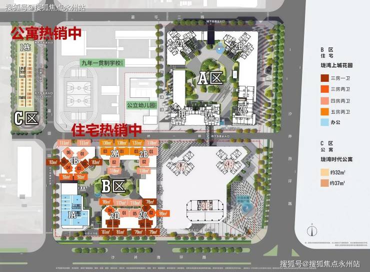 项目当前可售房源集中在2C、3A、3B栋,剩余约170席臻藏房源,主力户型为78-113㎡三至四房,同时有32-37㎡一居室及91-130㎡三至五房加推产品,均为精装交付,全屋配置一线知名品牌。