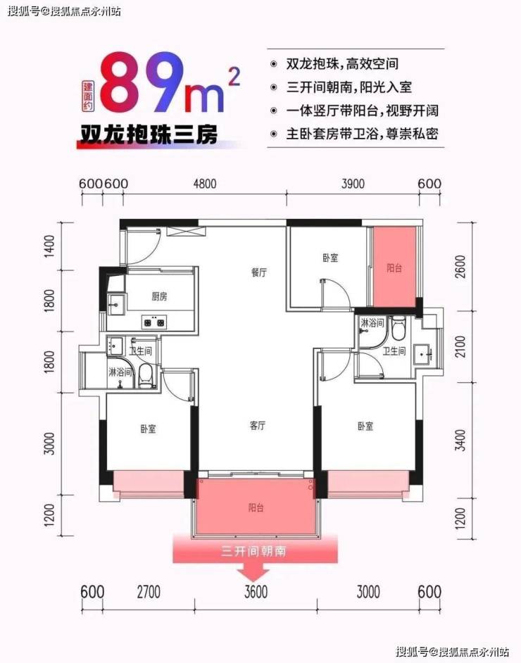 89㎡三房两卫:折后总价360万-383万元(单价约4.04万-4.3万元/㎡),东南朝向双阳台设计。