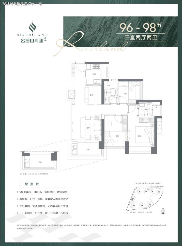 96-98㎡的3房2厅2卫,1-7单元05户型,设计的是经典竖厅格局,餐客厅一体化,客厅3.5米开间,S墙设计预留冰箱位,三开间朝南,3个卧室分别做到了主卧12.39㎡/次卧9.54㎡/次卧6.11㎡(实测面积,去掉墙体),U型厨房,得房率:74.84%(不含赠送),阳台1.5米进深,东南朝向。