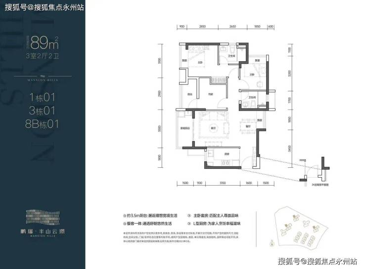 01户型:89㎡的3房2卫,设计的南北通透竖厅格局,客厅3.5米开间,三开间朝南,L型厨房,3个卧室做到了2.9/3.2/3.1米的宽度,阳台主朝西南向。