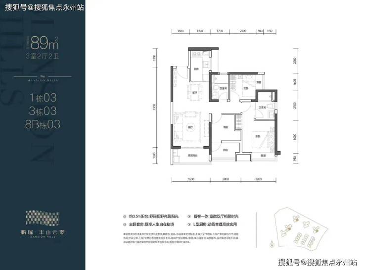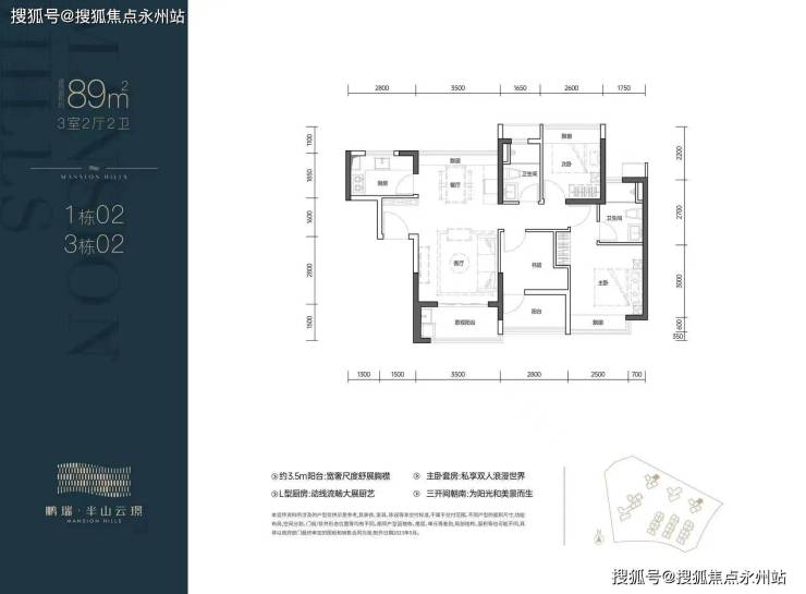 02户型:89㎡的3房2卫,设计的南北通透竖厅格局,客厅3.5米开间,三开间朝南,L型厨房,3个卧室做到了2.6/2.8/3.2米的宽度,阳台主朝东南向。
