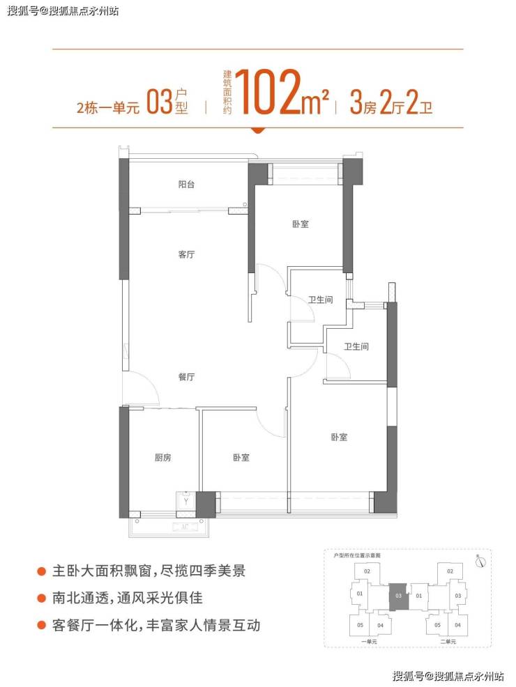 102㎡的3房2厅2卫,02户型,设计的是竖厅南北通透格局,客厅3.5米开间,LDKB一体化设计,动静分区,三开间朝南,U型厨房,卫生间干湿分离,得房率:72.3%(不含赠送),西北或东南朝向。