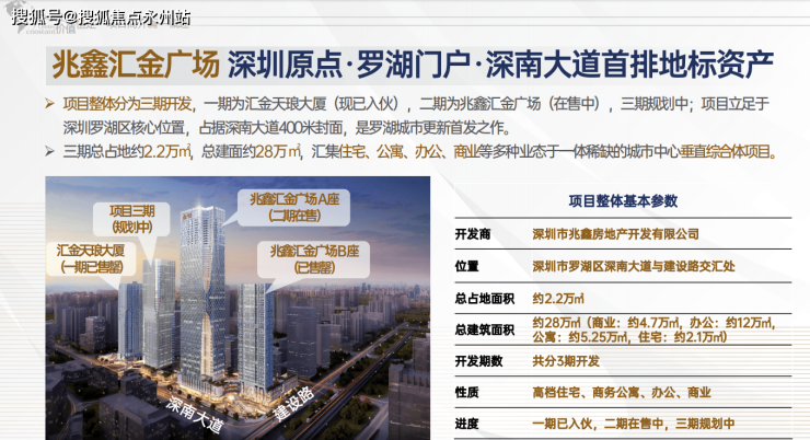 兆鑫汇金广场项目占据深南大道400m沿街封面,262m地标高度,是金三角城市更新首发之作,涵盖了商业办公、商务公寓、总裁公寓等业态的约28万㎡综合体(深圳罗湖兆鑫汇金广场售楼处电话:400-992-0669)