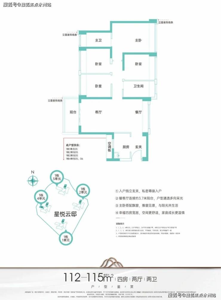 建面约112㎡户型则为户型方正、动静科学分区的四房两卫设计,更能满足多人口家庭的全周期居住需求。
