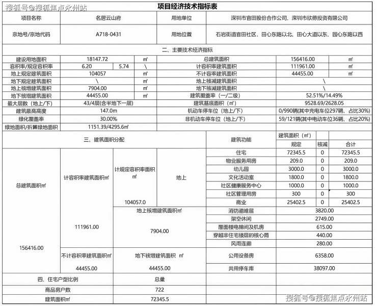 项目开发建设用地面积约18148㎡含社区配套用地,总建筑面积15.64万㎡涵盖住宅、幼儿园及配套商业,容积率为5.73-6.2不同规划阶段数据略有调整,建筑形态为3幢43层150米超高层住宅,车位配置了990个,车位比1:1.37满足每户至少1个车位需求。
