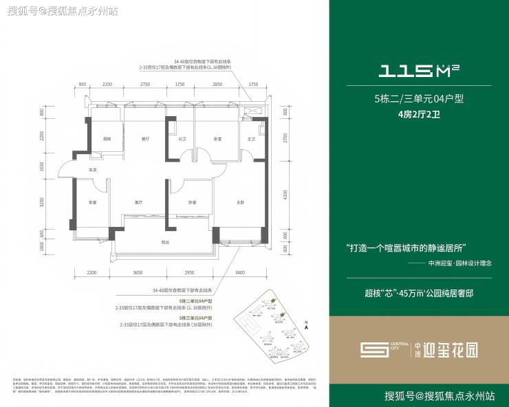 建面约115㎡4房2卫(90套)格局设计:竖厅南北通透,独门独户,四开间朝南,南向面宽约10.5 米,6.6米阔景阳台,连通客厅与次卧,采光充足,可作为家庭活动区,面积约17.5㎡,配备独立卫浴及飘窗,收纳空间充足,灵动次卧,北向次卧可改造为书房或儿童房,满足多元需求。
