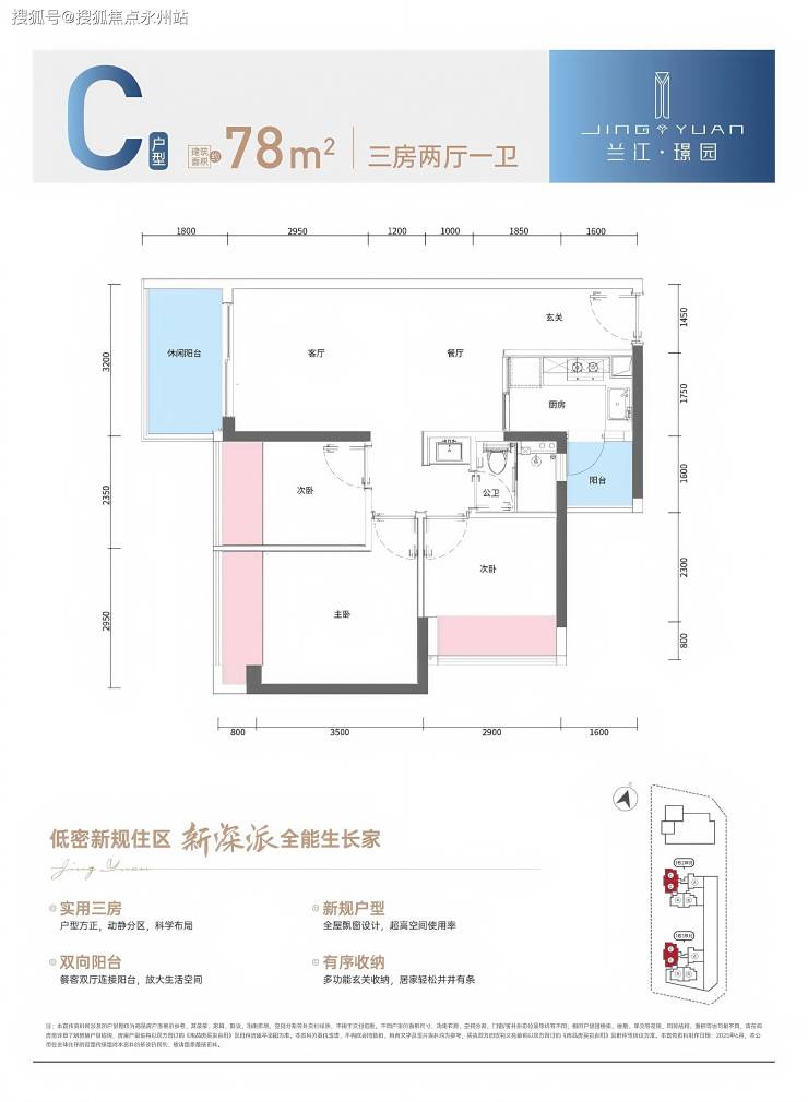 78-89㎡三房:竖厅设计,主卧带 270° 转角飘窗,客餐厅一体化,进深比约 1:1.5,采光系数≥1.5(优于行业标准 1.2)