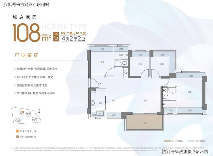108㎡的4房2厅2卫:设计的是横厅南北通透格局,进门独立玄关,客餐厅6.4米开间,LDKB一体化,五开间朝南,主卧双飘窗通透设计,全屋10个凸窗,4个卧室分别做到了主卧17.01㎡/次卧9.7㎡/次卧8.4㎡/次卧7.35㎡(包含墙体飘窗),L型厨房,卫生间干湿分离,得房率约91.88%(包含赠送),阳台主朝西南或东南向。