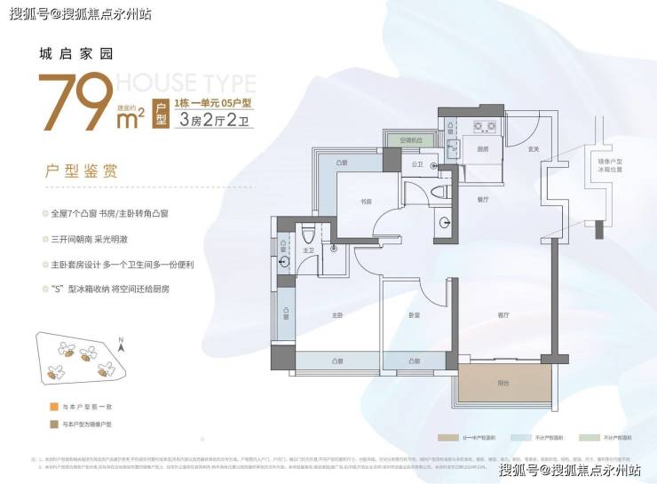 79㎡的3房2厅2卫:设计的是经典竖厅格局,客厅3.3米开间,LDKB一体化,S墙设计预留冰箱卡槽位,动静分区,三开间朝南,3个卧室分别做到了主卧12.1㎡/次卧7.36㎡/次卧6.67㎡(包含墙体飘窗),主卧+1个次卧270°飘窗设计,U型厨房,公卫三段式分离,得房率约88%(包含赠送),东南或西南朝向。