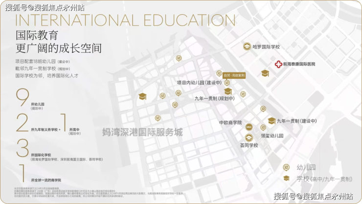 教育方面,自带1所18班幼儿园,东南侧规划有1所九年制36班公办学校(待建),目前还没公布,大概率也是南二外集团校区,会跟紫荆府同步交付;另外在东南侧距离700米处有一所南山第二外国语学校创新学校妈湾校区(在建,预计明年首届招生)