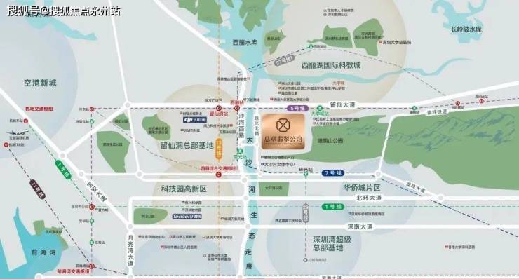 项目西侧为西丽留仙洞总部基地,东北侧为大学城,东侧为塘朗山,西南侧是西丽高铁站。