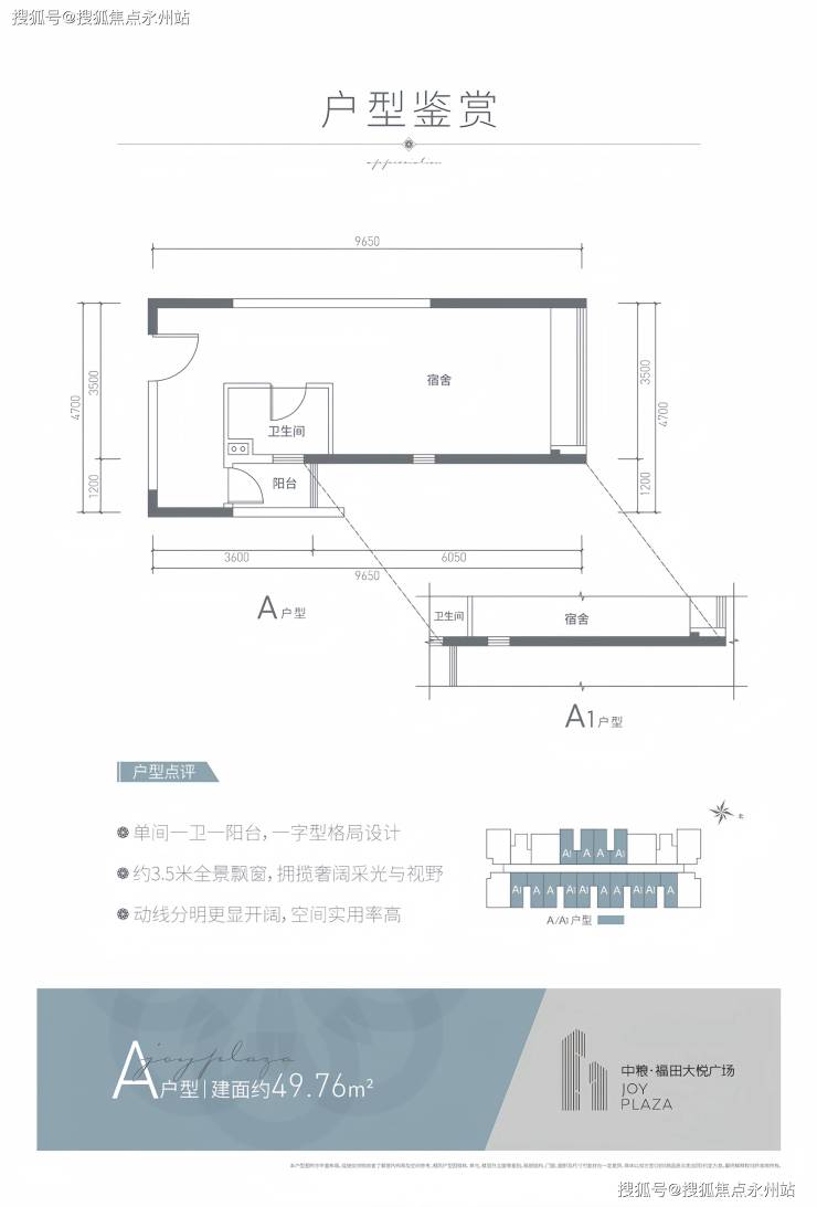 配套宿舍:1室1厅1卫:建面约 49-51㎡,户型方正,动静分离,3.1 米层高,带阳台。