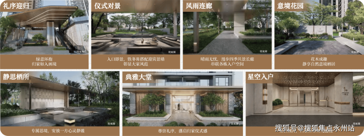 公区&花园所见皆为名贵植被、石材铺装、干挂岩板、铝板覆盖件,部分区域还应用了拼花、拼色、造型工艺,能明显感觉它的越级品质。