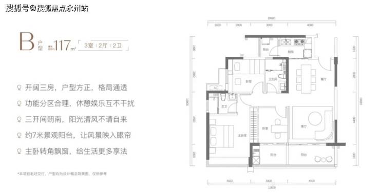 B户型为开阔三房设计,户型方正、格局通透,空间舒展,功能分区科学合理。客厅连接宽约7m的宽幅景观阳台,南向可望蔚蓝大海与晴空万里,景观面极佳。