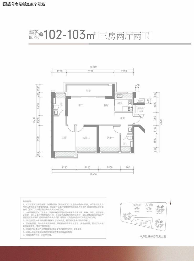 102㎡-103㎡的3房2厅2卫:横厅格局,主打的就是客厅宽大以及良好的通透性,客厅进深6.2米,开间3.7米(不含阳台),还配有长6.2米宽景阳台,这个户型很比较讨喜年轻的购房群体,因为横厅的户型南北通透,特别是深圳夏长冬短的地区;横厅户型还有一个优点,过道的面积少,同等面积空间利用率高,客厅或者房间的面积都稍微大些;