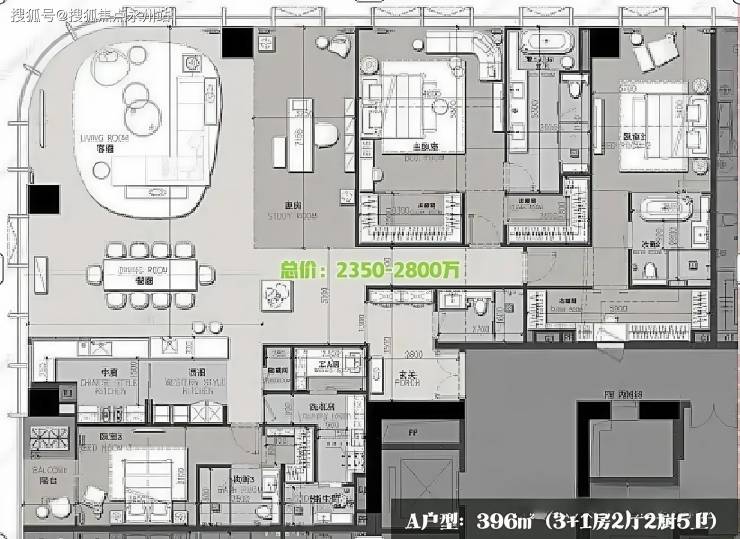 A户型:396㎡(3+1房2厅2厨5卫)LSD操刀、270°城市景观、全套房、双主卧设计、9.9米客餐开间、主卧面积高达24㎡、明卫设计。