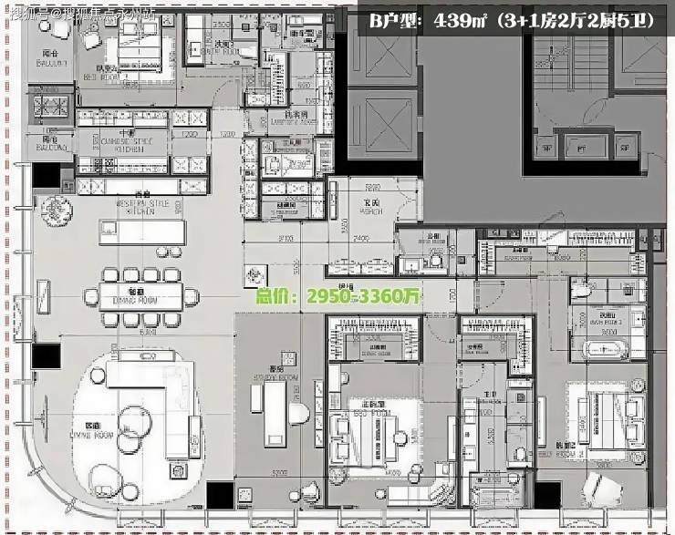 B户型:439㎡(3+1房2厅2厨5卫)LSD操刀、270°城市+绿化景观、高区看海、10米客餐开间。