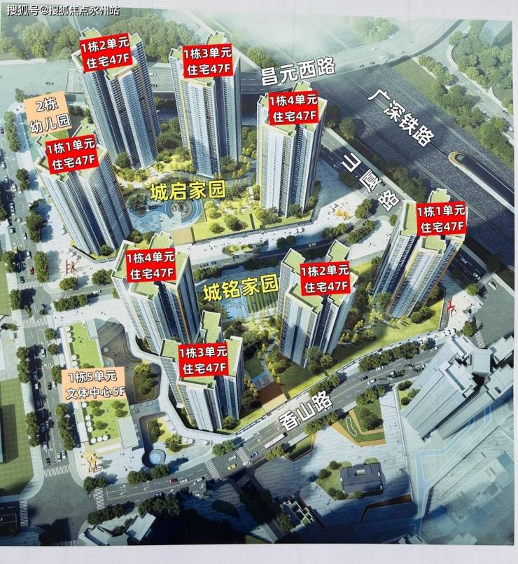 城启家园占地面积约1.65万㎡,总建筑面积约13.75万㎡,计容建筑面积约10.5万㎡,容积率6.38,绿化率40%,共由4栋47层高的住宅组成,配建1所9班幼儿园。